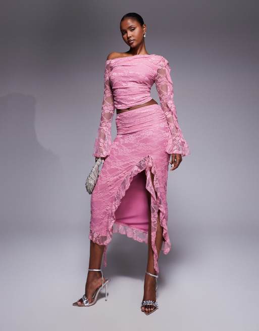 Love Triangle - Støvet lyserød midinederdel med asymmetriske flæser i blondestof - Del af sæt