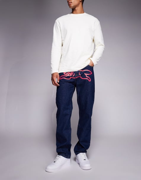 ICECREAM - Indigoblå jeans med lige ben og rhinstensbesat logo med løbende hund