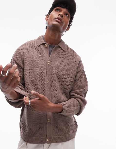 ASOS DESIGN - Brun strikket oversized poloskjorte med tekstur og gennemgående knapper - Del af sæt