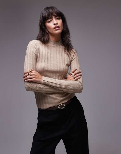 Mango - Beige og ribstrikket top med høj hals