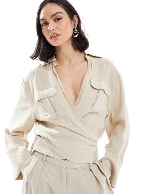 Mango - Beige skjorte med slå-om-snit foran - Del af sæt