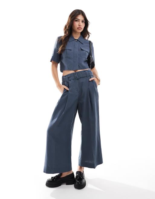 Mango - Blåt sæt med cropped skjorte med åben ryg og bindebånd og bukser med vide ben