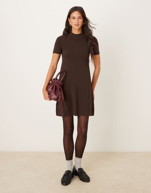 Mango - Brun og kortærmet minikjole i strik med høj hals