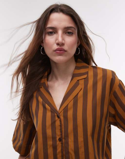 Mango - Brun pyjamasskjorte med tonede striber i bomuld - Del af sæt