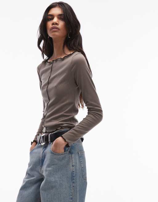 Mango - Brun top med bølgekant og kontrasterende syningsdetalje