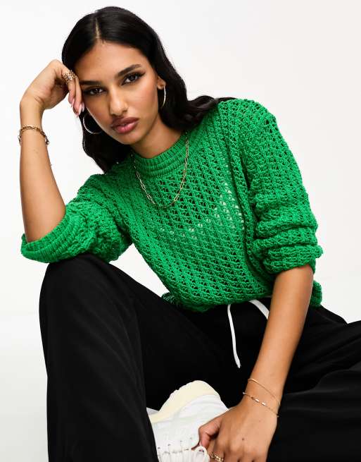 Mango - Grøn, kabelstrikket, cropped og langærmet sweater
