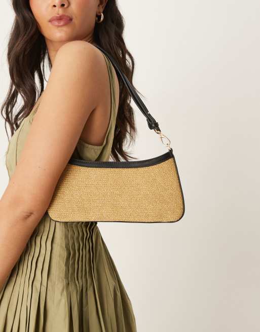 Mango - Gyldenbrun skuldertaske i raffia med sort kant