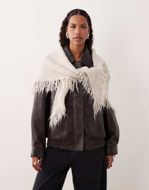 Mango - Havrefarvet sjal med frynser i strikket uldblanding