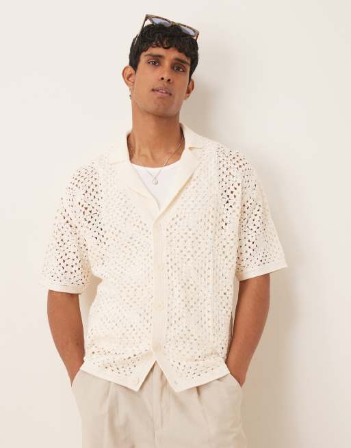 Mango - Hvid hæklet skjorte med åben krave og korte ærmer i bomuldsblanding