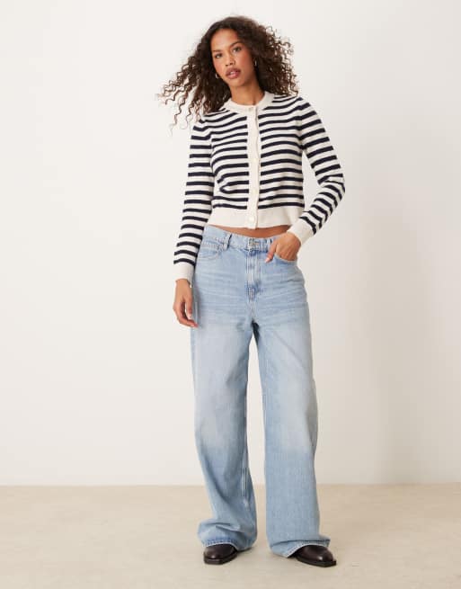 Mango - Hvid lodden cardigan med striber og guldfarvede knapper