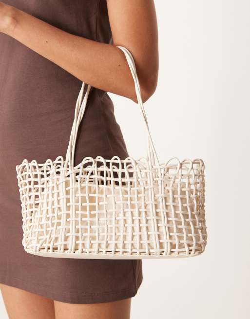 Mango - Hvid vævet lille tote-taske med for og indvendig løbesnor