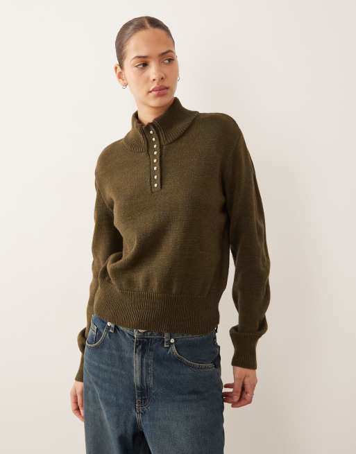 Mango - Kakigrøn trøje med høj hals og knapdetaljer