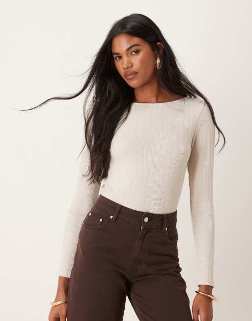 Mango - Lys beige top med lange ærmer i blandet ribstrik