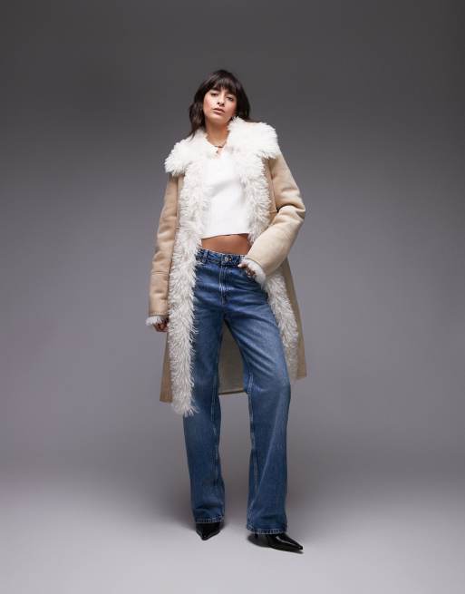 Mango - Lysebrun longline-frakke med for i imiteret lammeskind