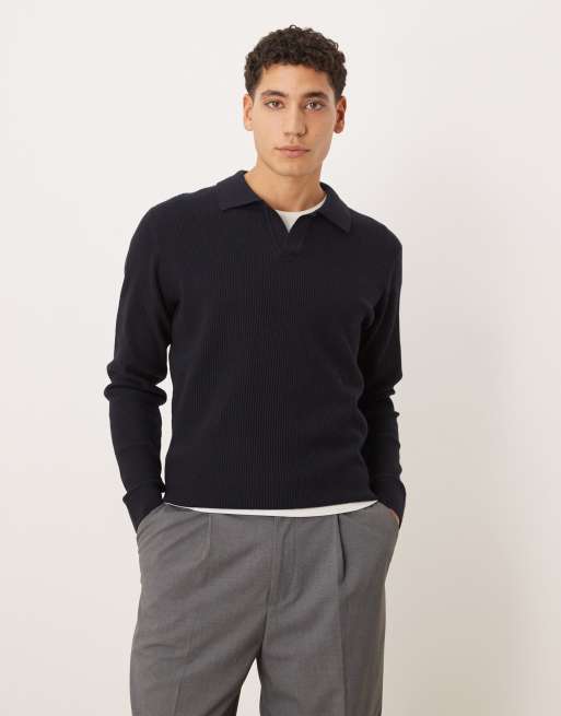 Mango - Marineblå strikket polotop i bomuldsblanding med reverskrave