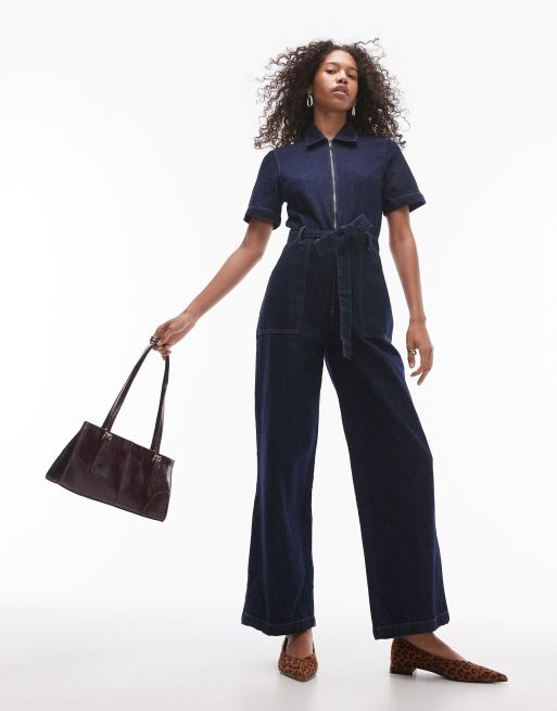 Mango - Mørkeblå jumpsuit i denim med bindebånd i taljen