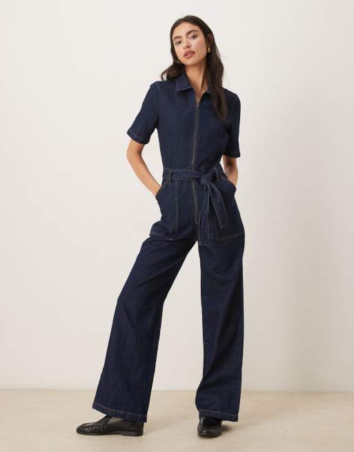 Mango - Mørkeblå kortærmet jumpsuit i denim af 100% bomuld med bælte