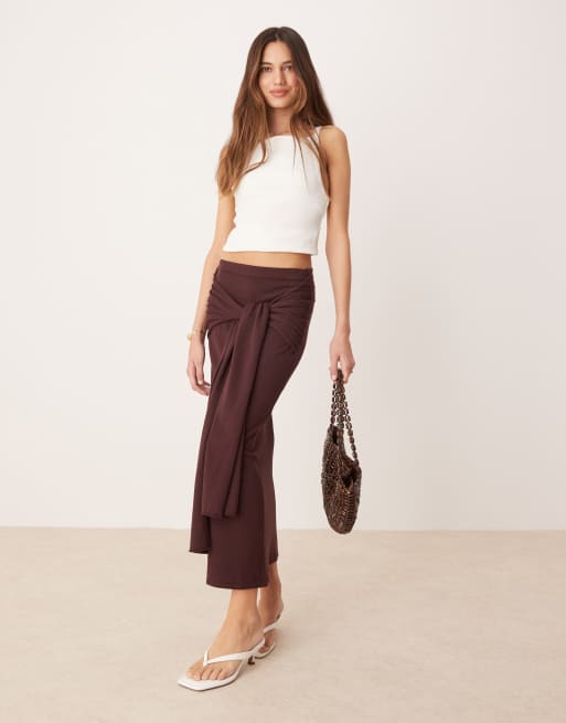 Mango - Mørkebrun nederdel med rynker og bindebånd i taljen