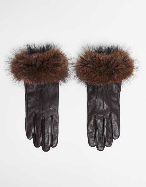 Mango - Mørkebrune handsker i 100% læder med kant i imiteret pels