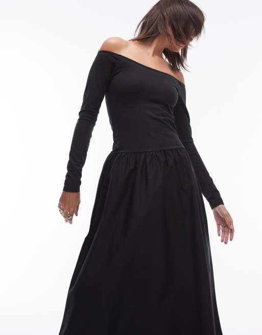 Mango - Sort bardot-midikjole med lavtsiddende talje