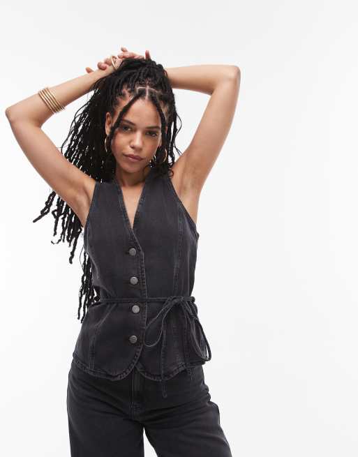 Mango - Sort habitvest med bindebånd foran i denim - Del af sæt