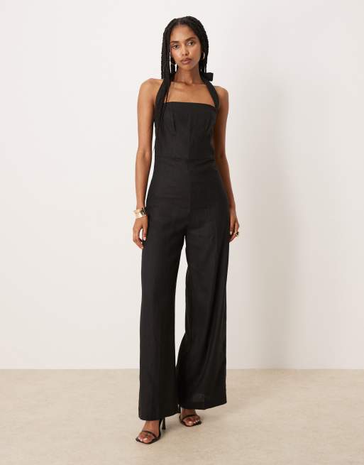 Mango - Sort jumpsuit med firkantet hals, halterneck og plisseringer foran