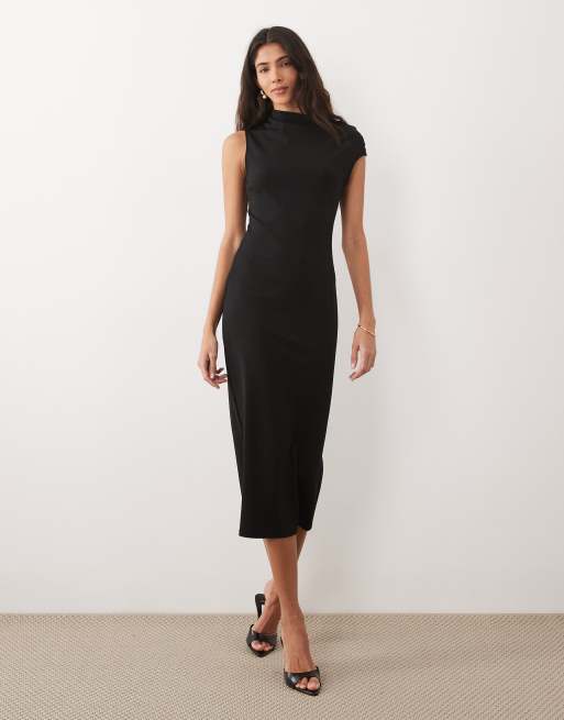 Mango - Sort midikjole med korte ærmer og asymmetrisk snit
