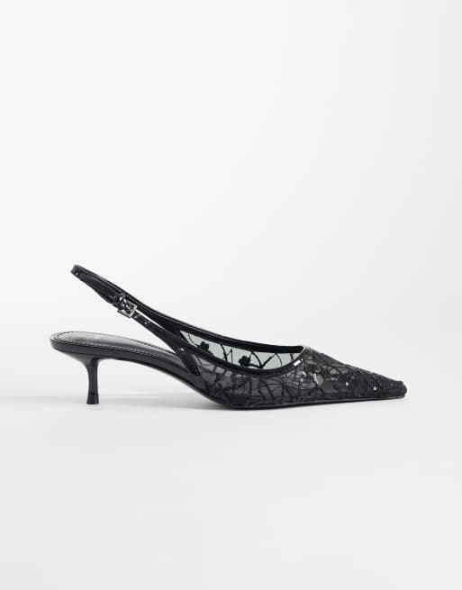 Mango - Sorte spidse sko med hælrem samt hæl og blondedetaljer