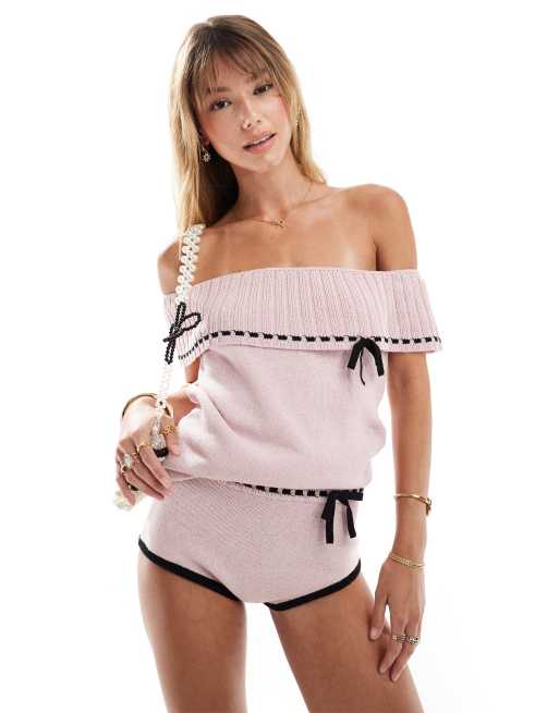 Mango - Strikket lyserød bardot-top med sløjfedetalje - Del af sæt