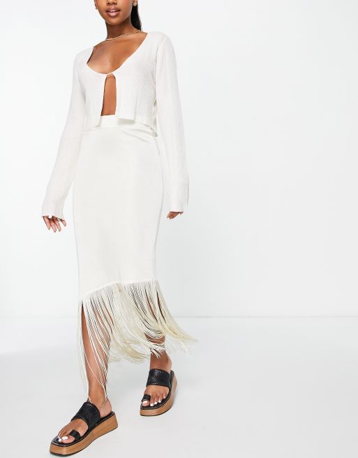 Mango - Strikket midinederdel med frynser i hvid
