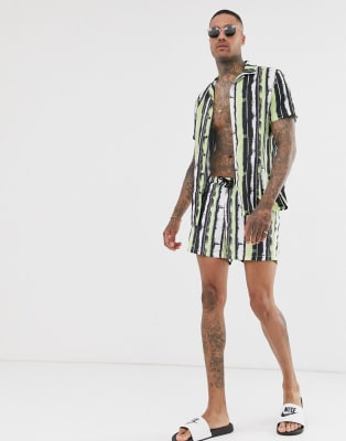Skjorte med reverskrave og badeshorts i syrefarvede striber fra Mauvais - del af sæt