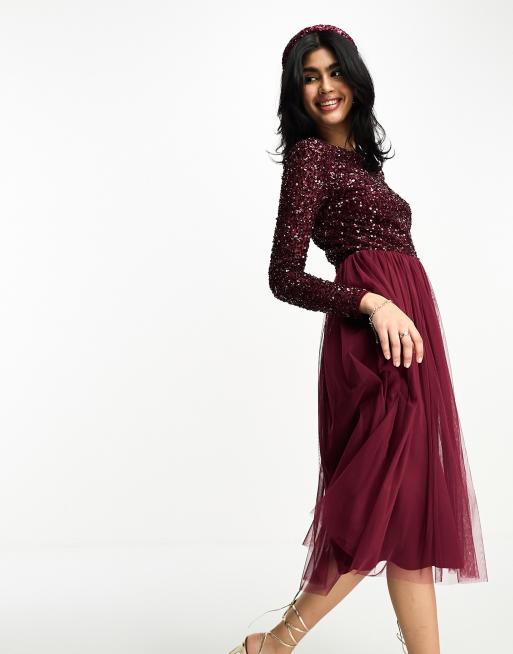 Maya - Brudepiger - Vinrød langærmet midikjole i tyl med fine tone-i-tone pailletter