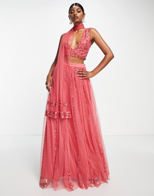 Maya - Rødt sæt med lehenga-maxinederdel, trekantscroptop og dupatta-tørklæde med udsmykninger