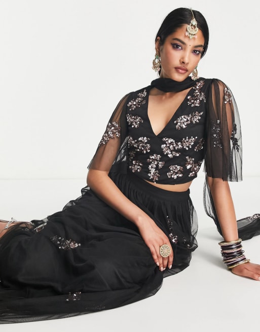 Maya - Sort lehenga-sæt med udsmykket småblomstret mønster