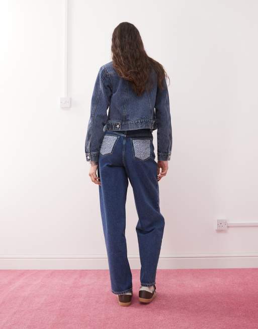 Miss Selfridge - Blå posede jeans med lapper med blomstermønster