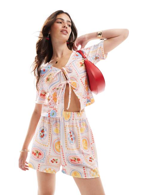 Miss Selfridge - Bluse med bindebånd fortil og postkortprint