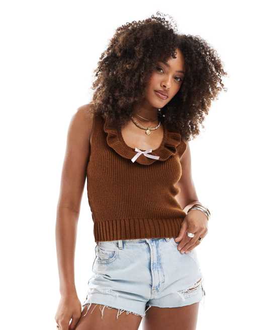 Miss Selfridge - Chokoladebrun strikket tanktop med flæser