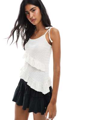 Miss Selfridge - Cremefarvet longline asymmetrisk top med flæser og bindebånd