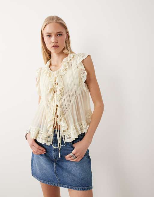 Miss Selfridge - Cremehvid bluse med blondekant og bindebånd foran i chiffon