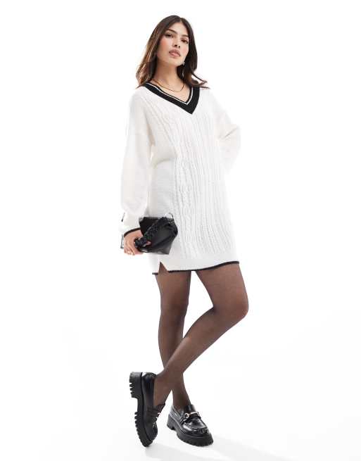 Miss Selfridge - Cremehvid minikjole med V-hals og college-design i kabelstrik