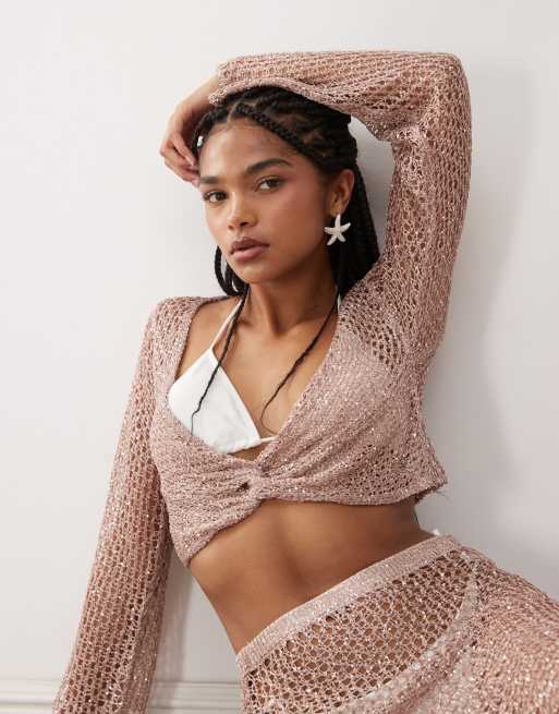 Miss Selfridge - Gammelrosa og langærmet strandtop med hæklet look, pailletter og snoet detalje