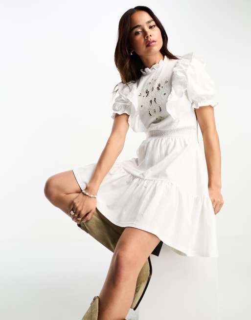 Miss Selfridge - Hvid lagdelt minikjole med pufærmer og cutwork
