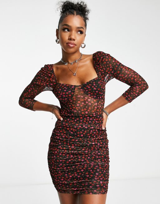 Miss Selfridge - Kjole i mesh med korset-detalje og småblomstret print