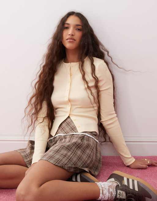 Miss Selfridge - Kærnemælksgul ribstrikket cardigan med gennemgående knapper og rund hals
