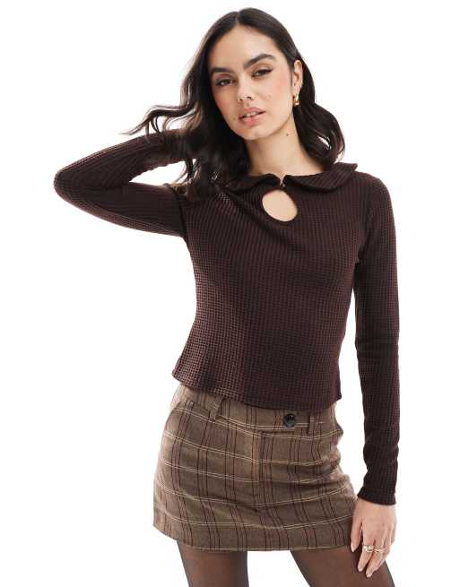 Miss Selfridge - Langærmet mørkebrun top med Peter Pan-krave og vaffeltekstur