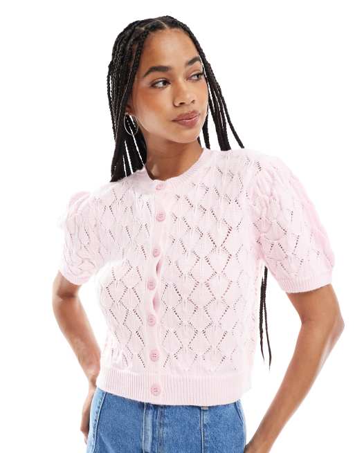 Miss Selfridge - Lyserød top med knapper og korte pufærmer i pointelle-strik