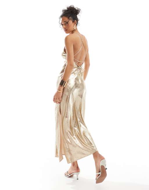 Miss Selfridge - Maxikjole med stropper og snøredetalje på ryggen i metallisk guldfarve