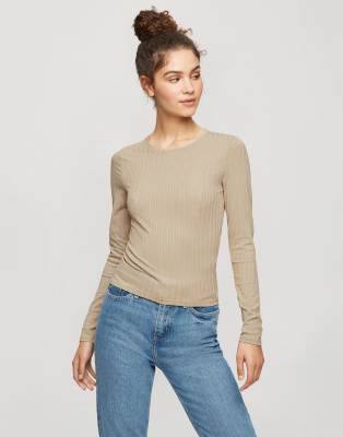 Miss Selfridge - Mokkafarvet, ribstrikket t-shirt med lange ærmer