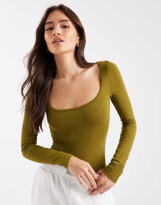 Miss Selfridge - Olivengrøn bodystocking med bred dyb rund hals