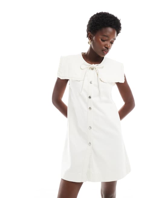 Miss Selfridge - Oversized ærmeløs denimkjole med krave og bindebånd i halsen
